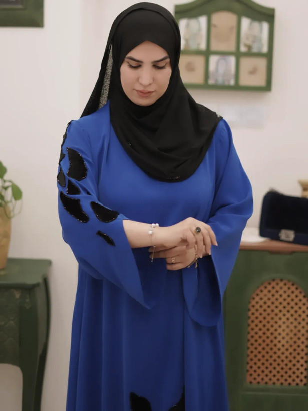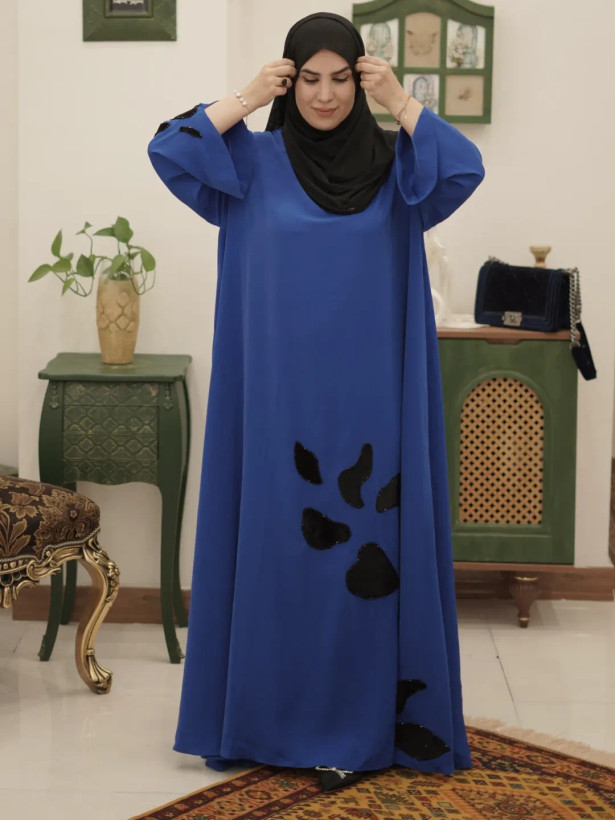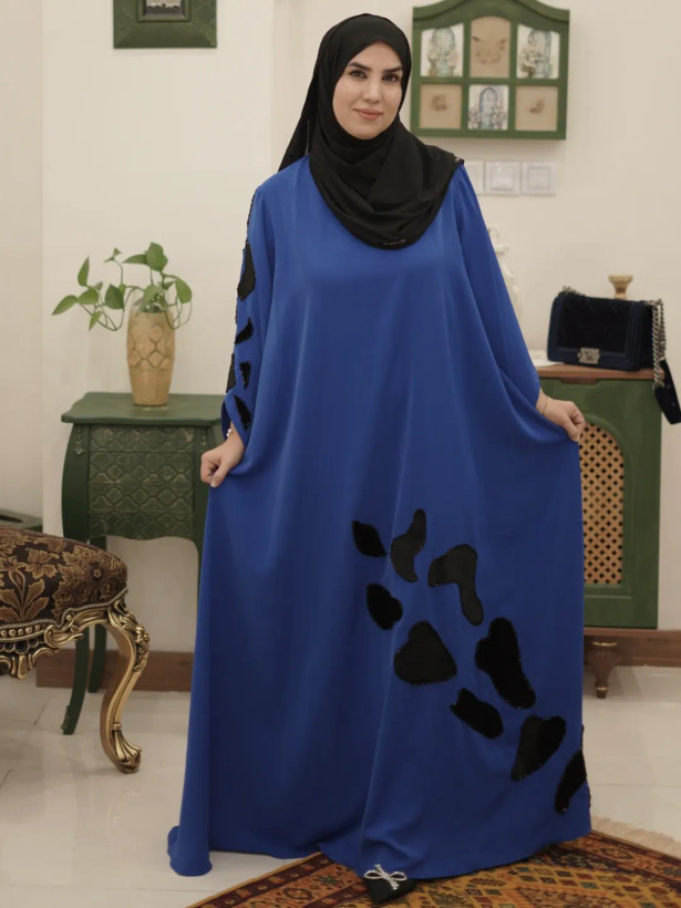 عبای سرمه با دست جواهردوزی شده و اپلیکهای مخمل اون رو خوشگل تر کرده. این کار مناسب مراسمات خاص شماست و با اون واقعا میدرخشید🤩