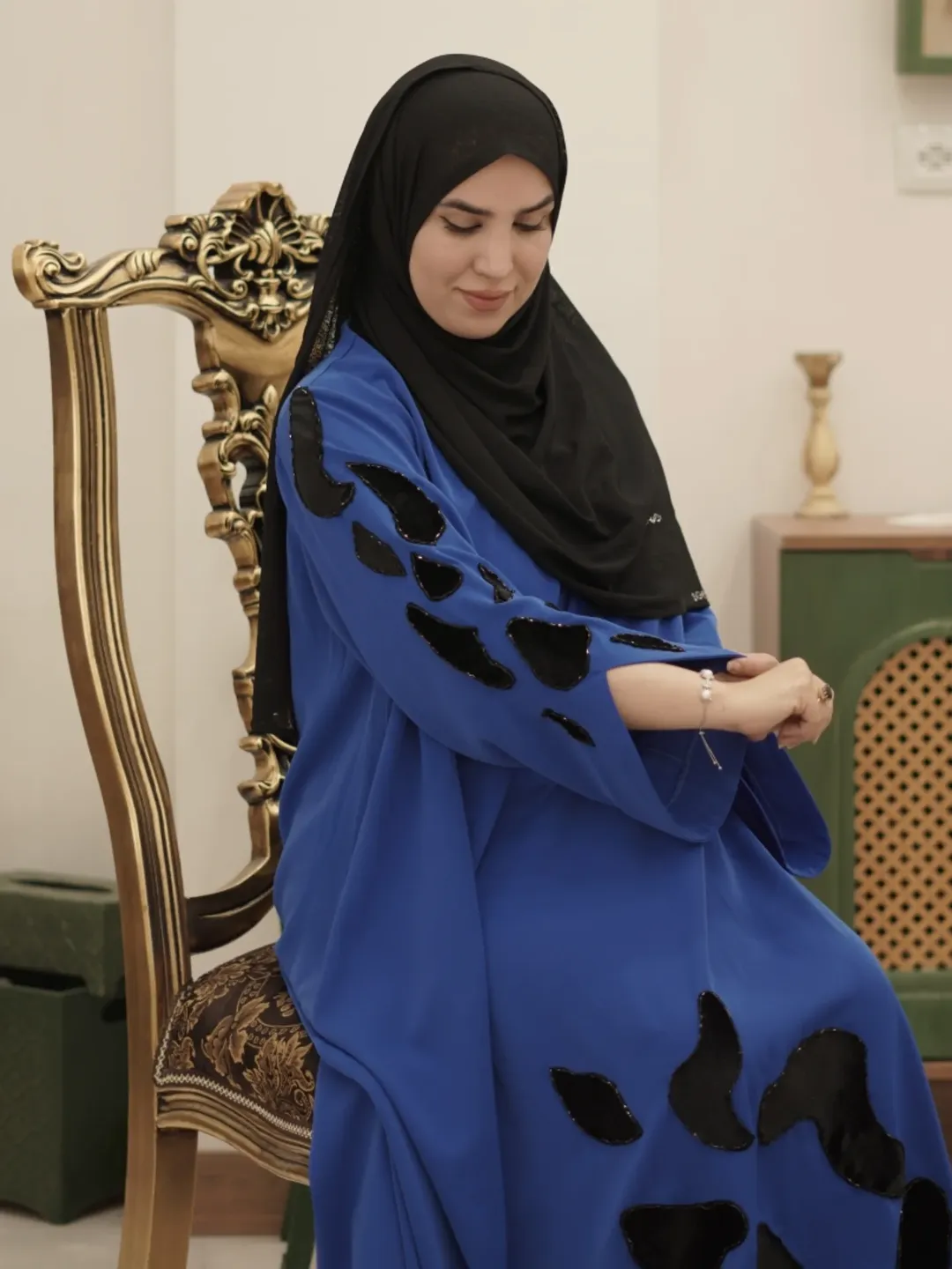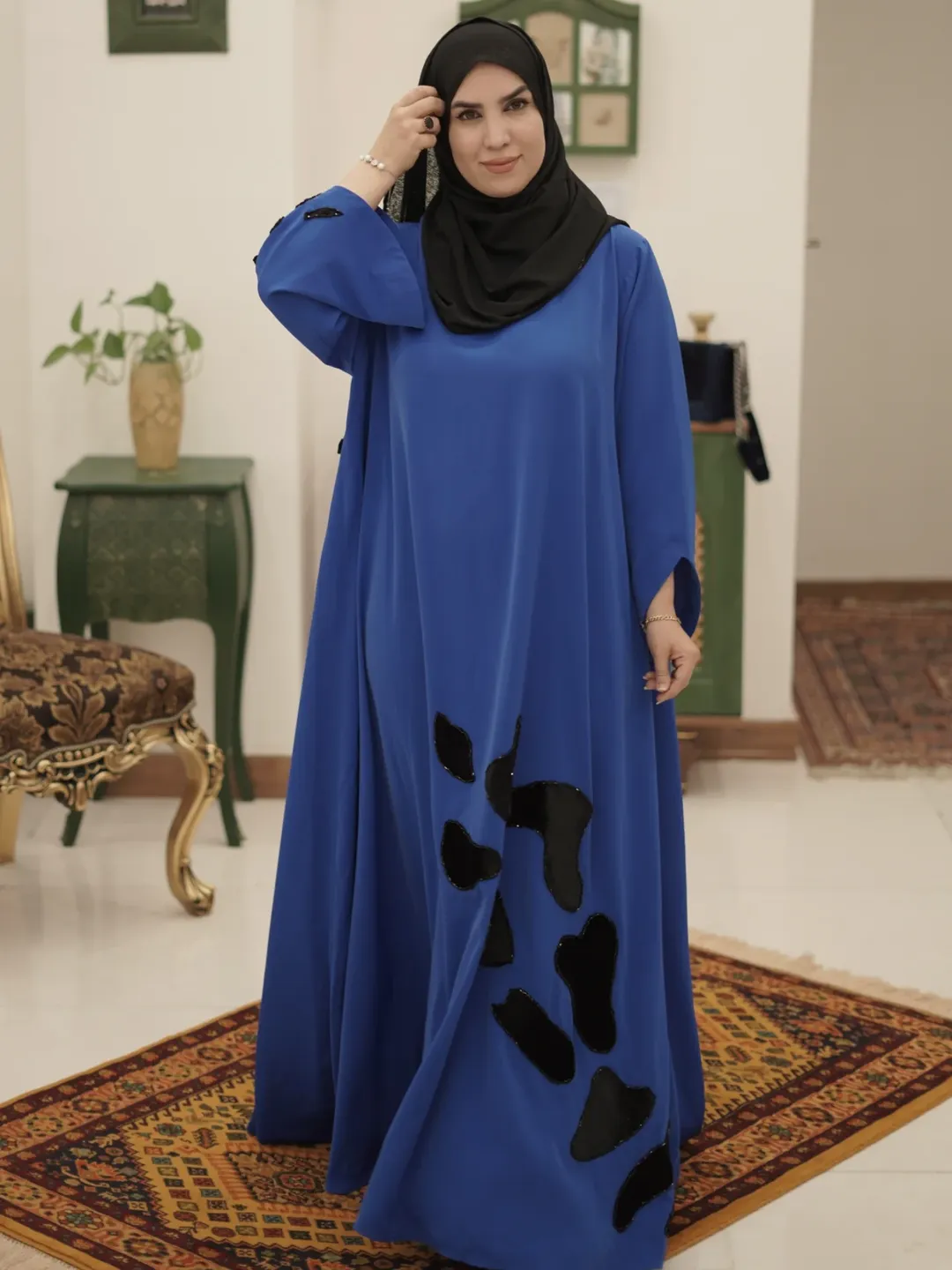 عبای سرمه با دست جواهردوزی شده و اپلیکهای مخمل اون رو خوشگل تر کرده. این کار مناسب مراسمات خاص شماست و با اون واقعا میدرخشید🤩